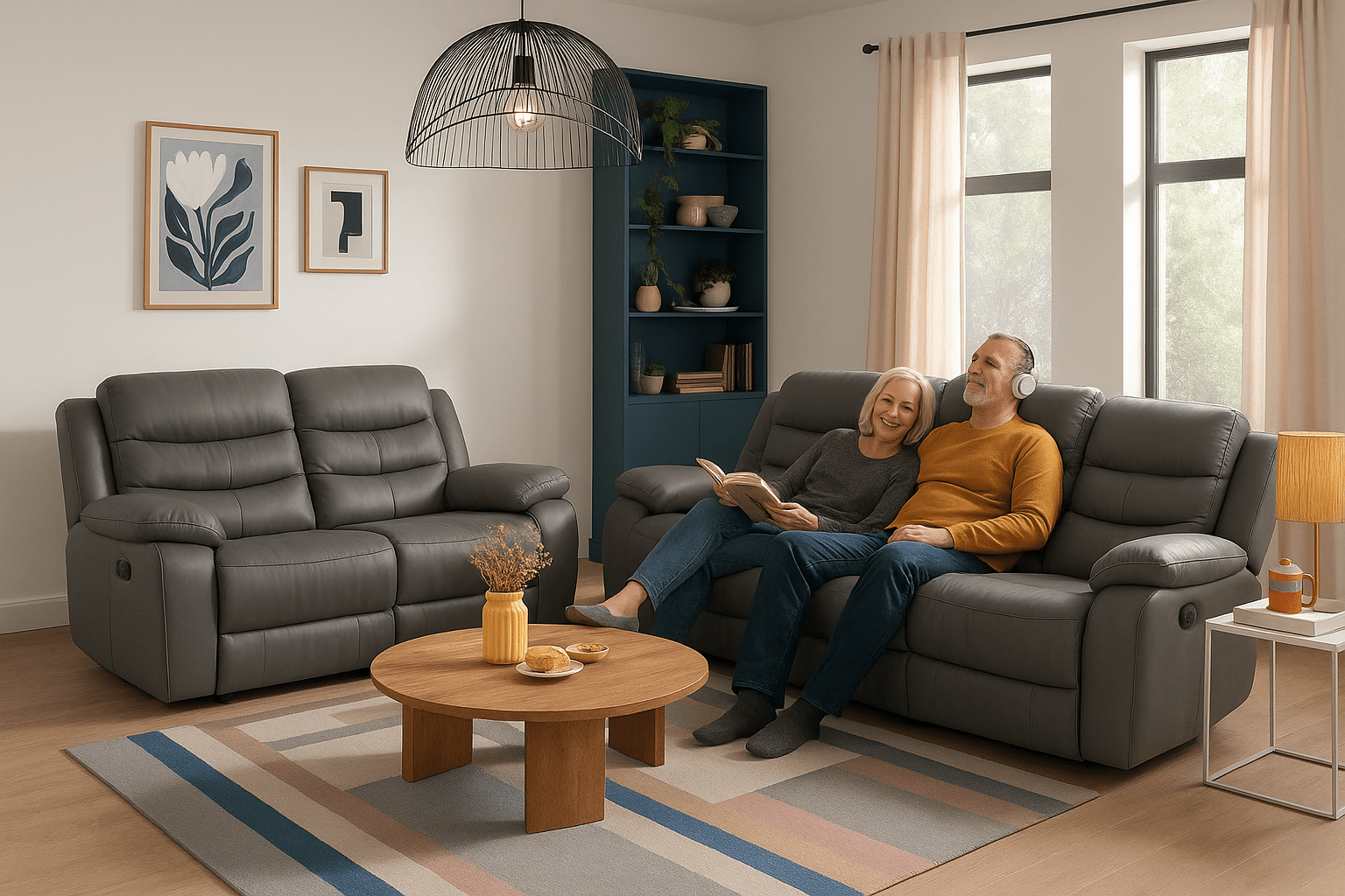 Available in a variety of colours including classic black, elegant grey, rich brown, and contemporary navy, our reclining sofa sets complement any interior décor. Select from genuine top-grain leather, easy-clean faux leather, or soft chenille fabric upholstery to match your lifestyle needs.