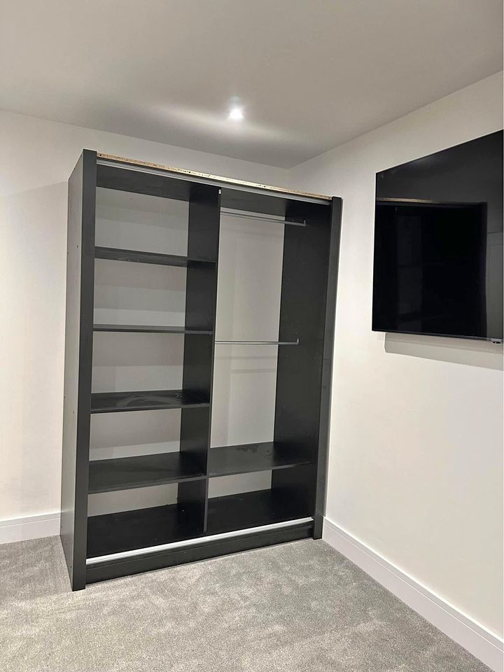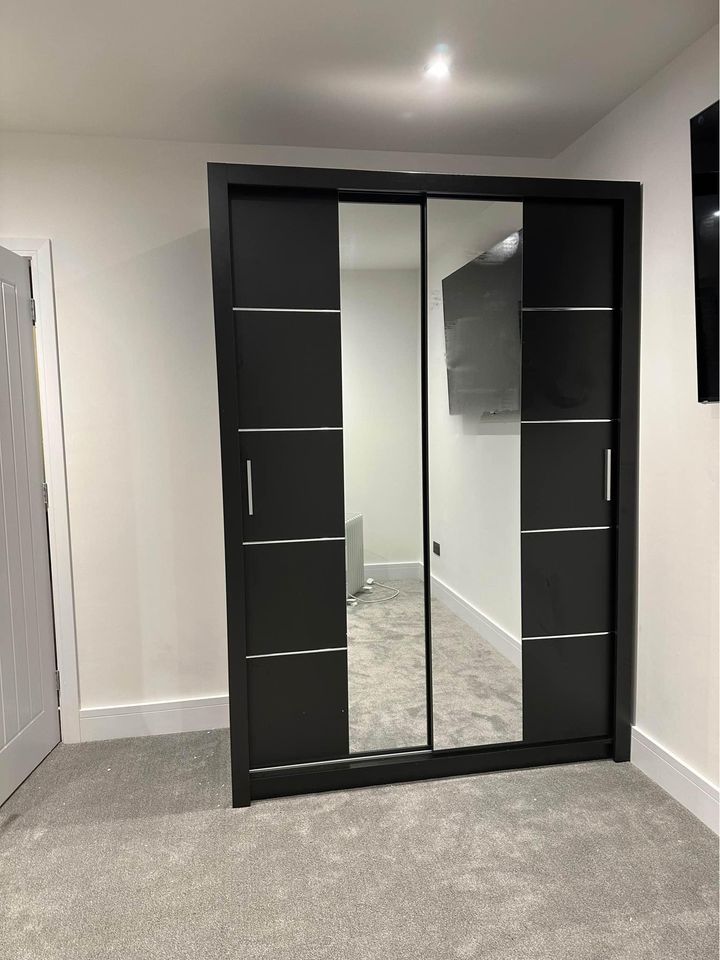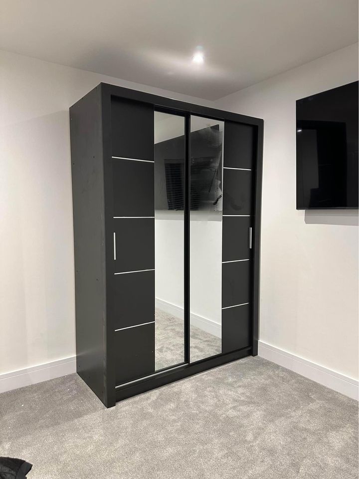 Transform your room with this small bedroom wardrobe with cheap price designed to maximize storage without taking up extra space. The Compact black sliding wardrobe 150cm Oslo brings a stylish modern finish, offering smooth sliding doors, a full-length mirror, adjustable shelves, and built-in drawers for organized living.